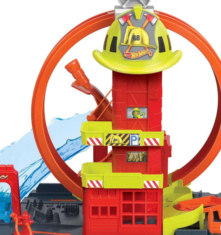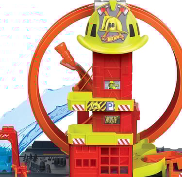 Action-packed rescue tower with loops and firehouse stunts kids love.