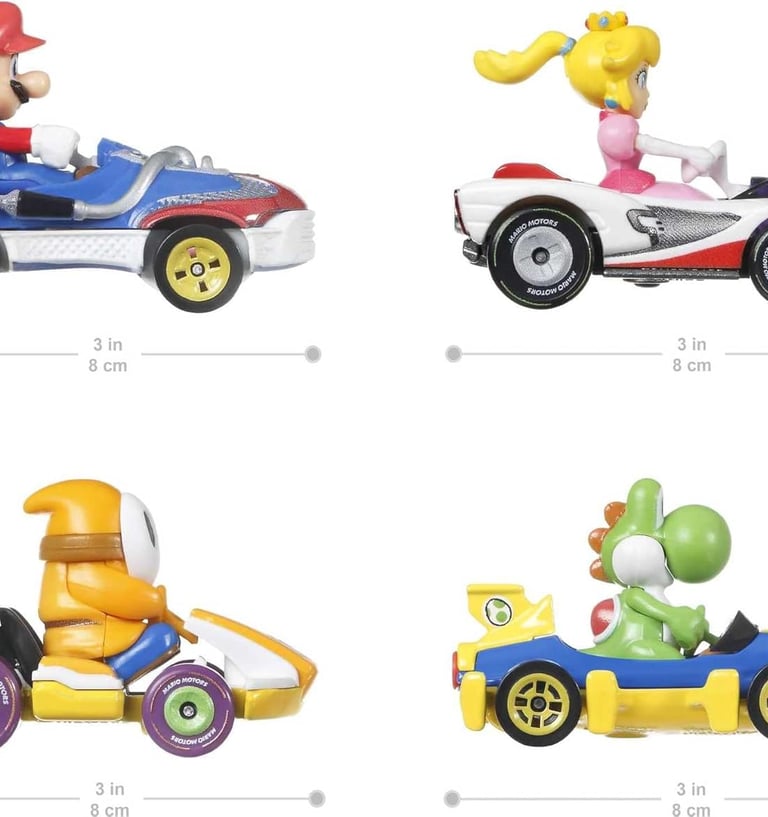 Fan-favorite Mario Kart characters in fast Hot Wheels die-cast cars.